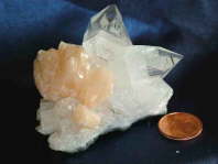 Zwei große transparente Apophyllit-Kristalle, sehr schön daneben als farblicher Kontrapunkt orange-gelber Stilbit
